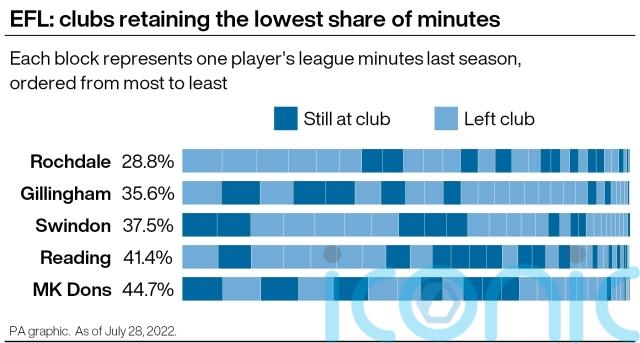 League Two side Rochdale have the most-changed squad in the EFL – only two of their most-used 11 players from last season are still at the club, with their retained list responsible for just 29 per cent of minutes.
